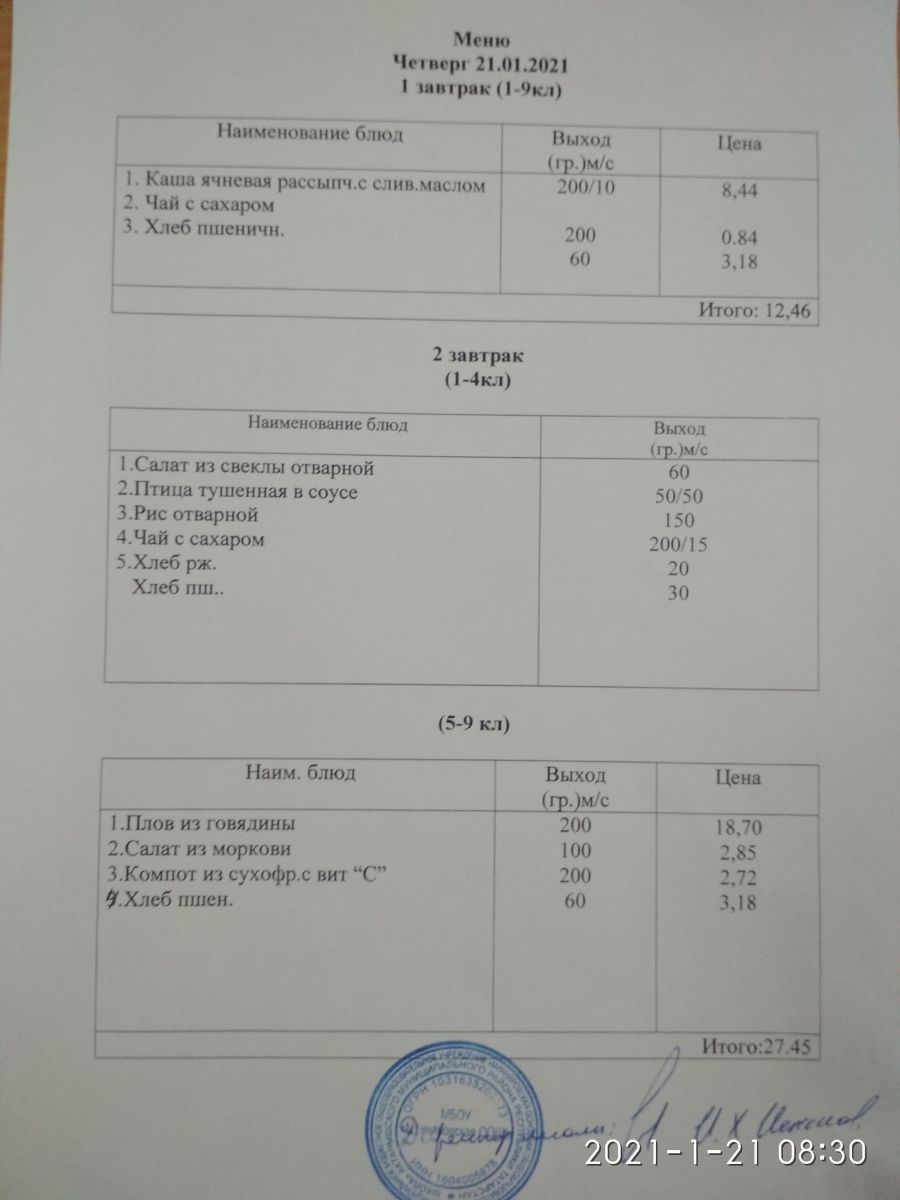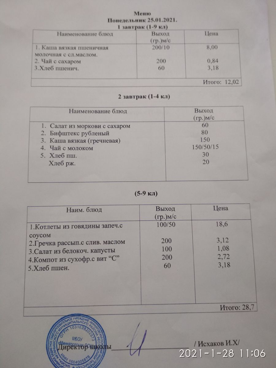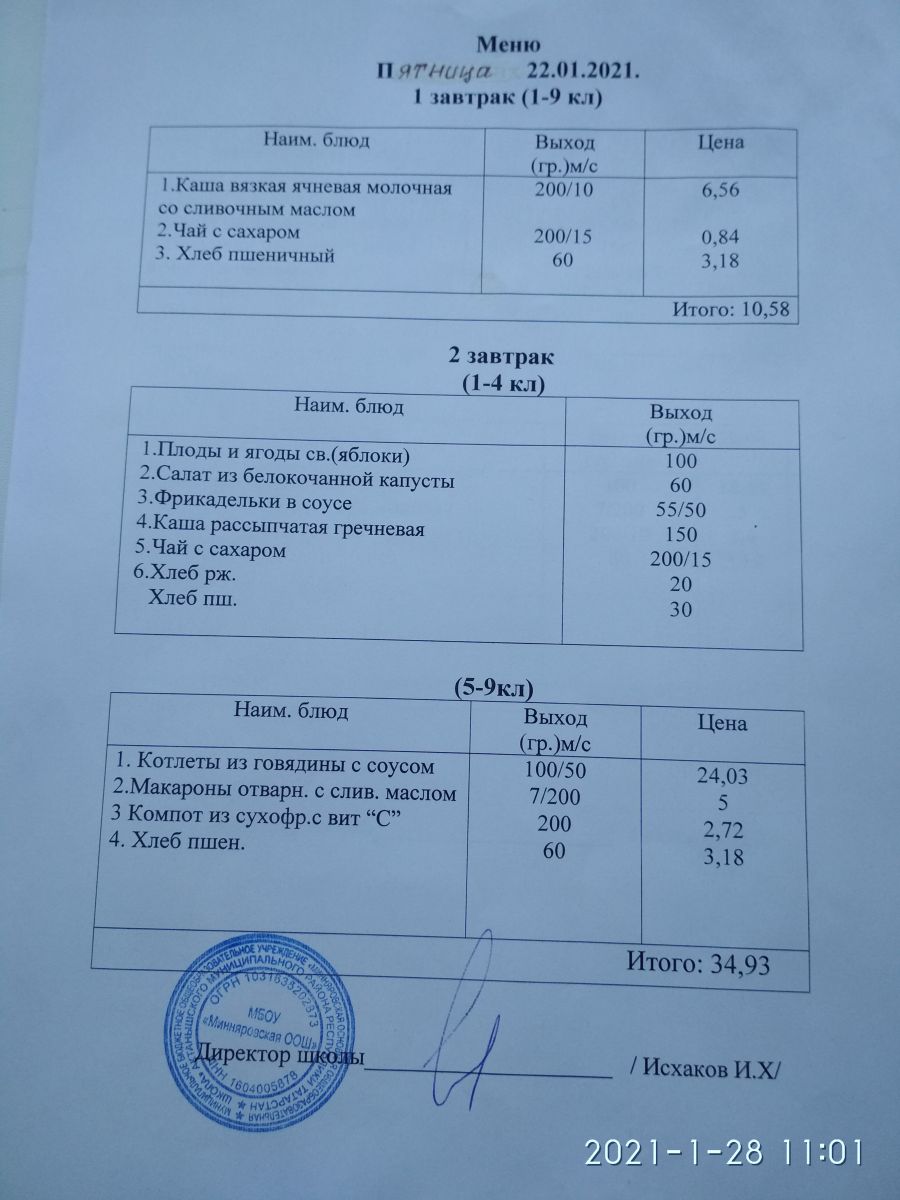 Меню МБОУ "Минняровская ООШ" на 25.01.2021, на 26.01.2021, на 27.01.2021, на 28.01.2021, на 29.01.2021, на 30.01.2021.