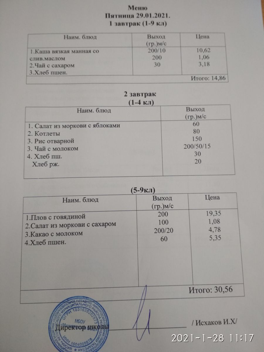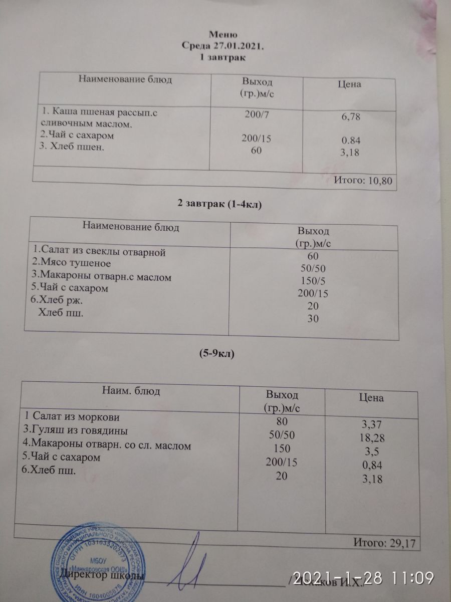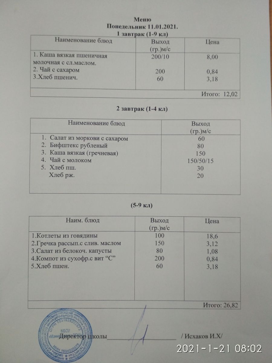Меню МБОУ "Минняровская ООШ" на 25.01.2021, на 26.01.2021, на 27.01.2021, на 28.01.2021, на 29.01.2021, на 30.01.2021.