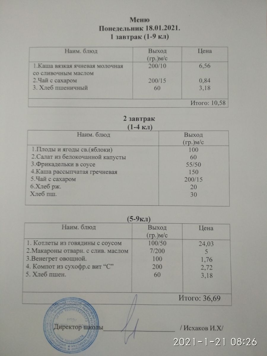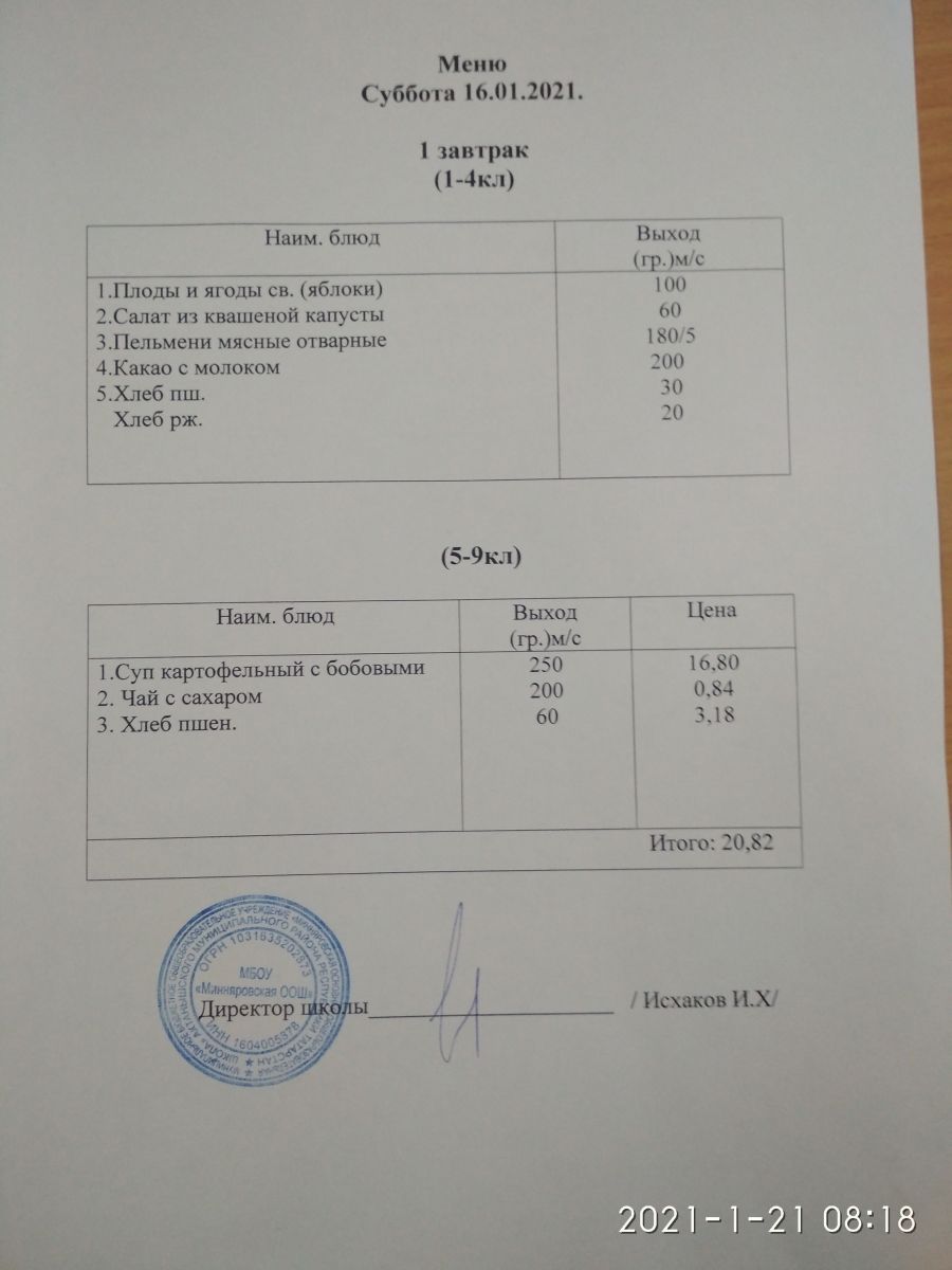 Меню МБОУ "Минняровская ООШ" на 18.01.2021, на 19.01.2021, на 20.01.2021, на 21.01.2021, на 22.01.2021, на 23.01.2021.