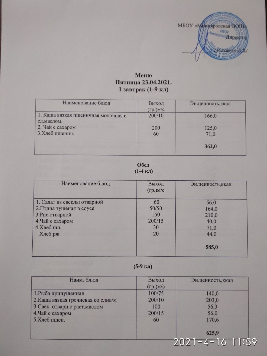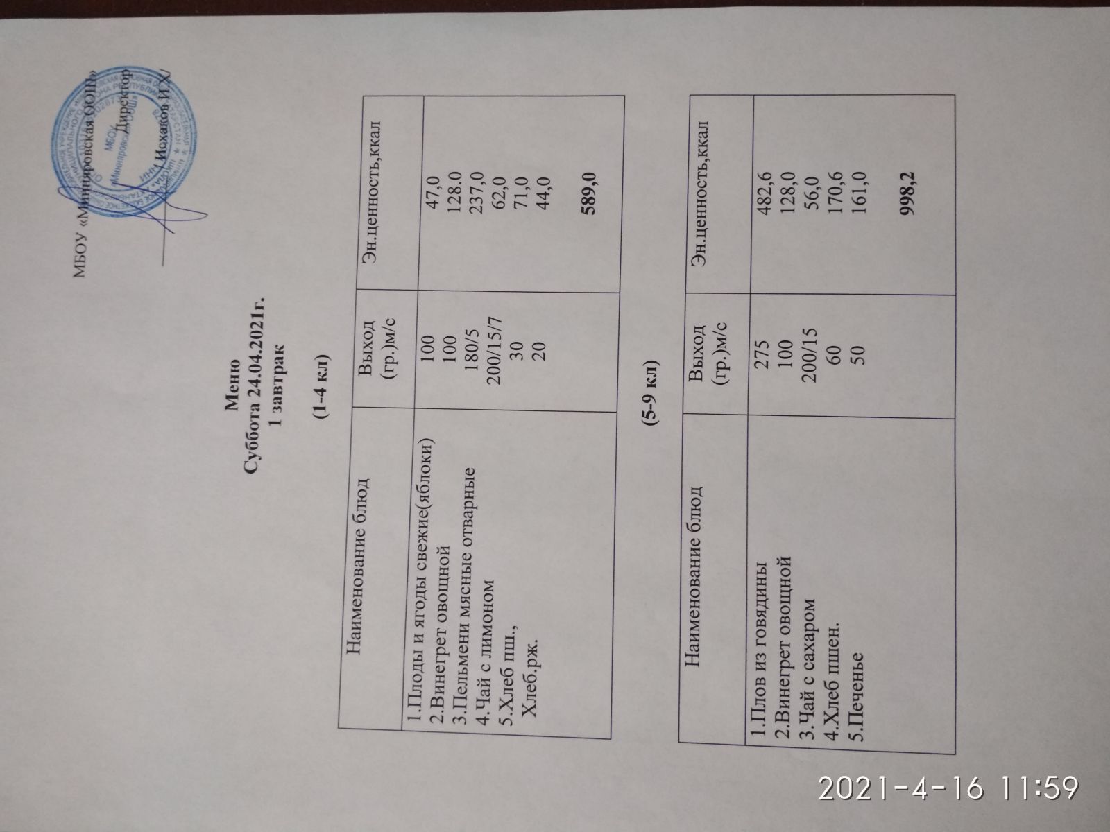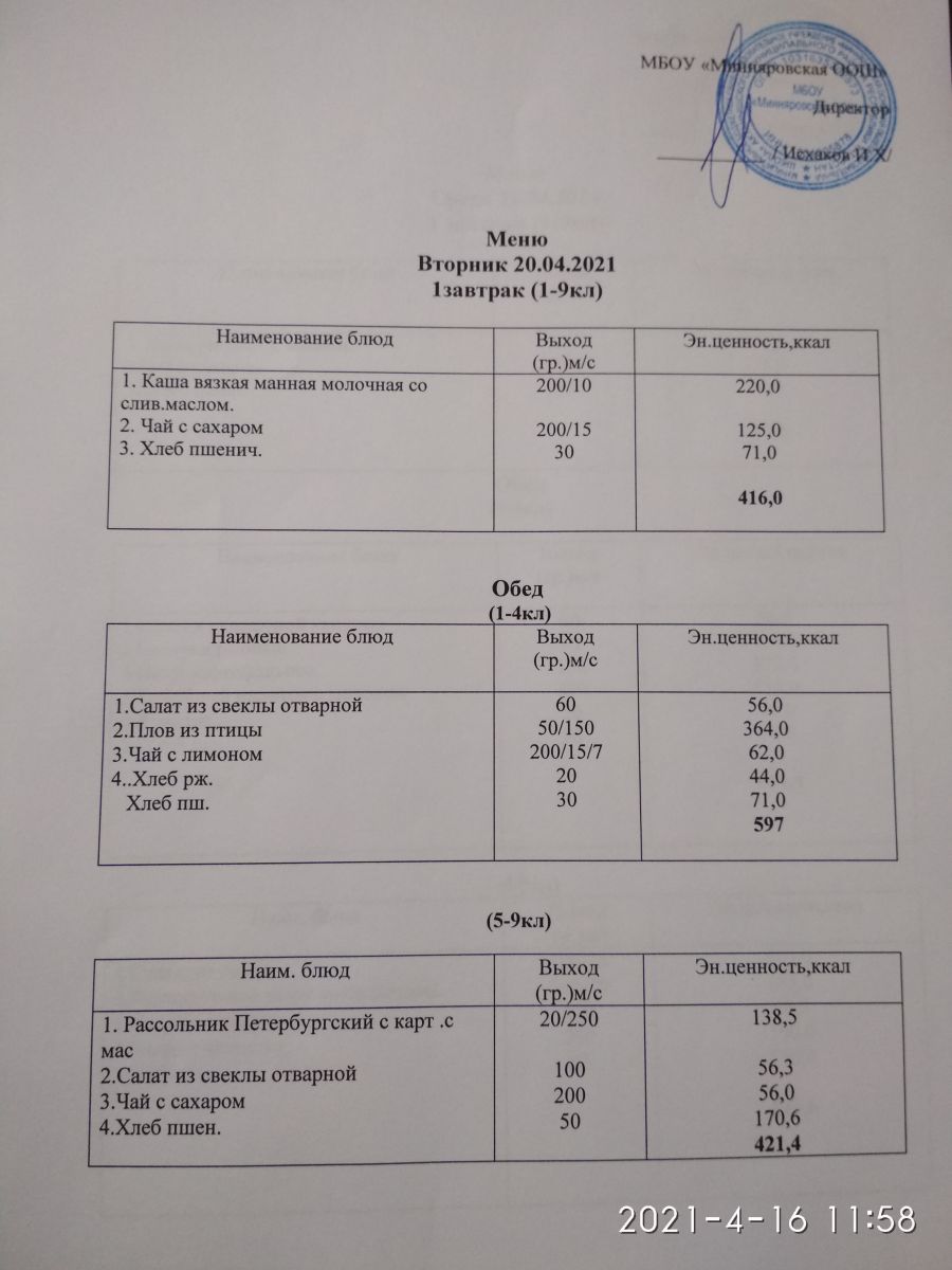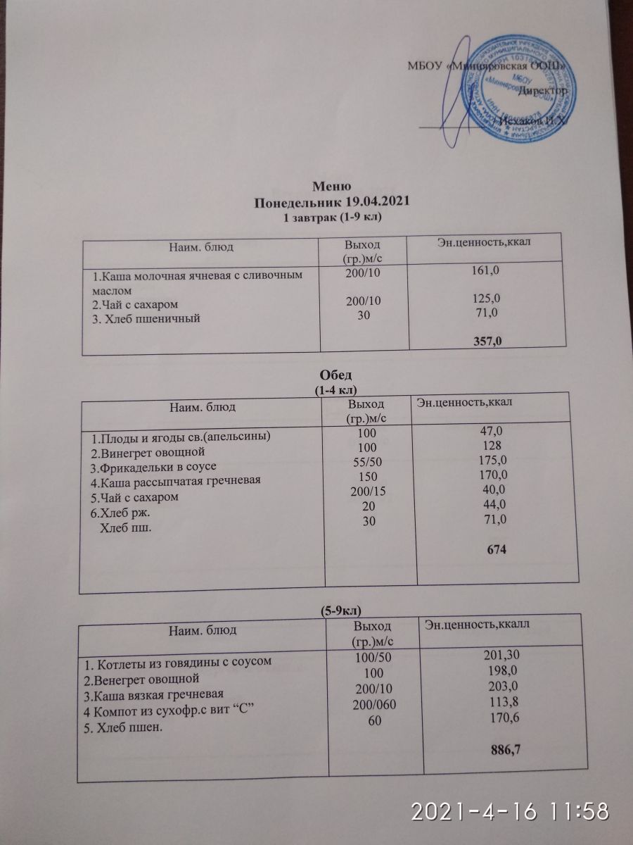 Меню МБОУ "Минняровская ООШ" на 19.04, на 20.04, на 21.04, на 22.04, на 23.04, на 24.04.2021 г.