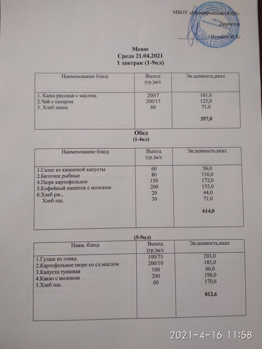 Меню МБОУ "Минняровская ООШ" на 12.04, на 13.04, на 14.04, на15.04, на 16.04, на 17.04 2021г.