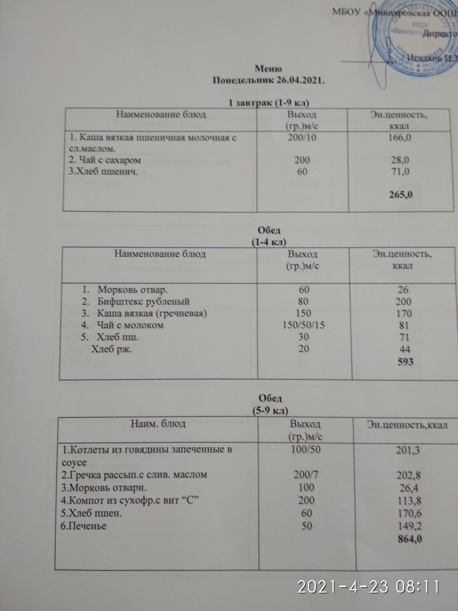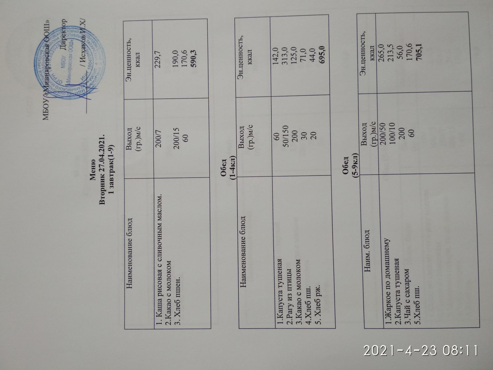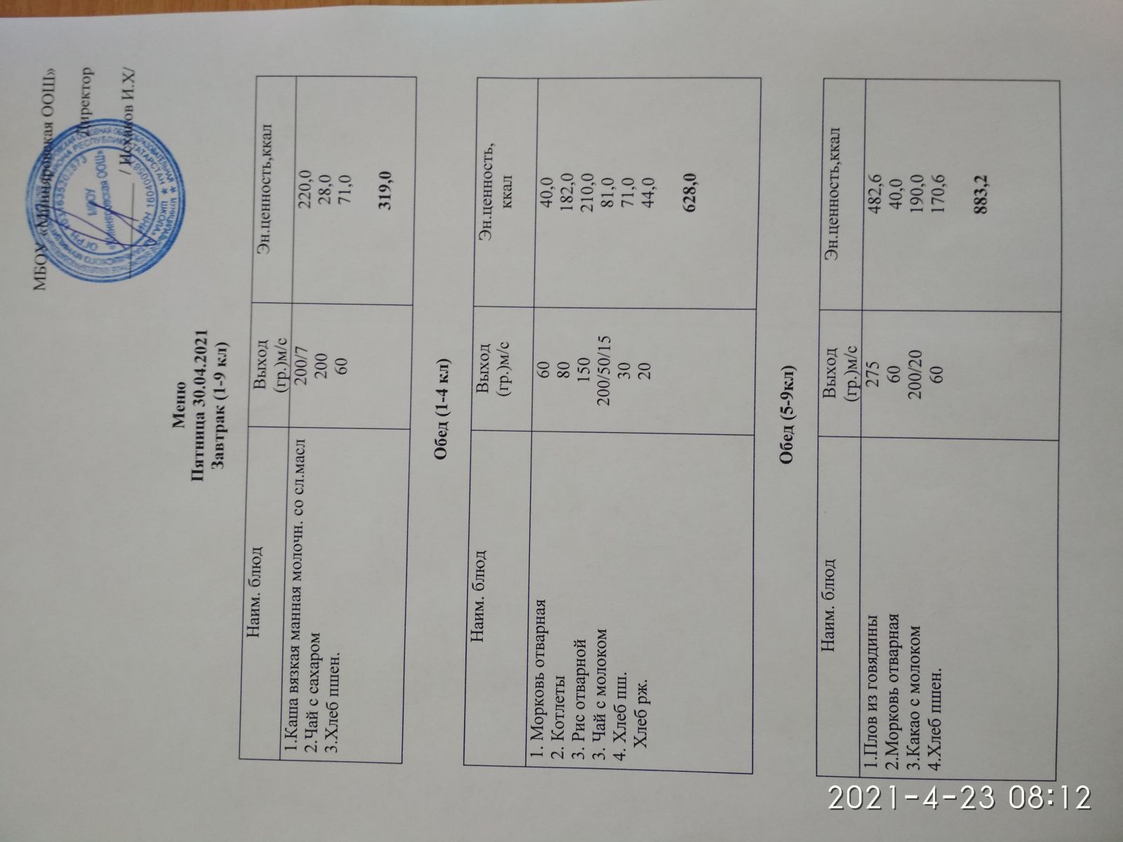 Меню МБОУ "Минняровская ООШ" на 26.04, на 27.04, на 28.04, на 29.04, на 30.04.2021 г.