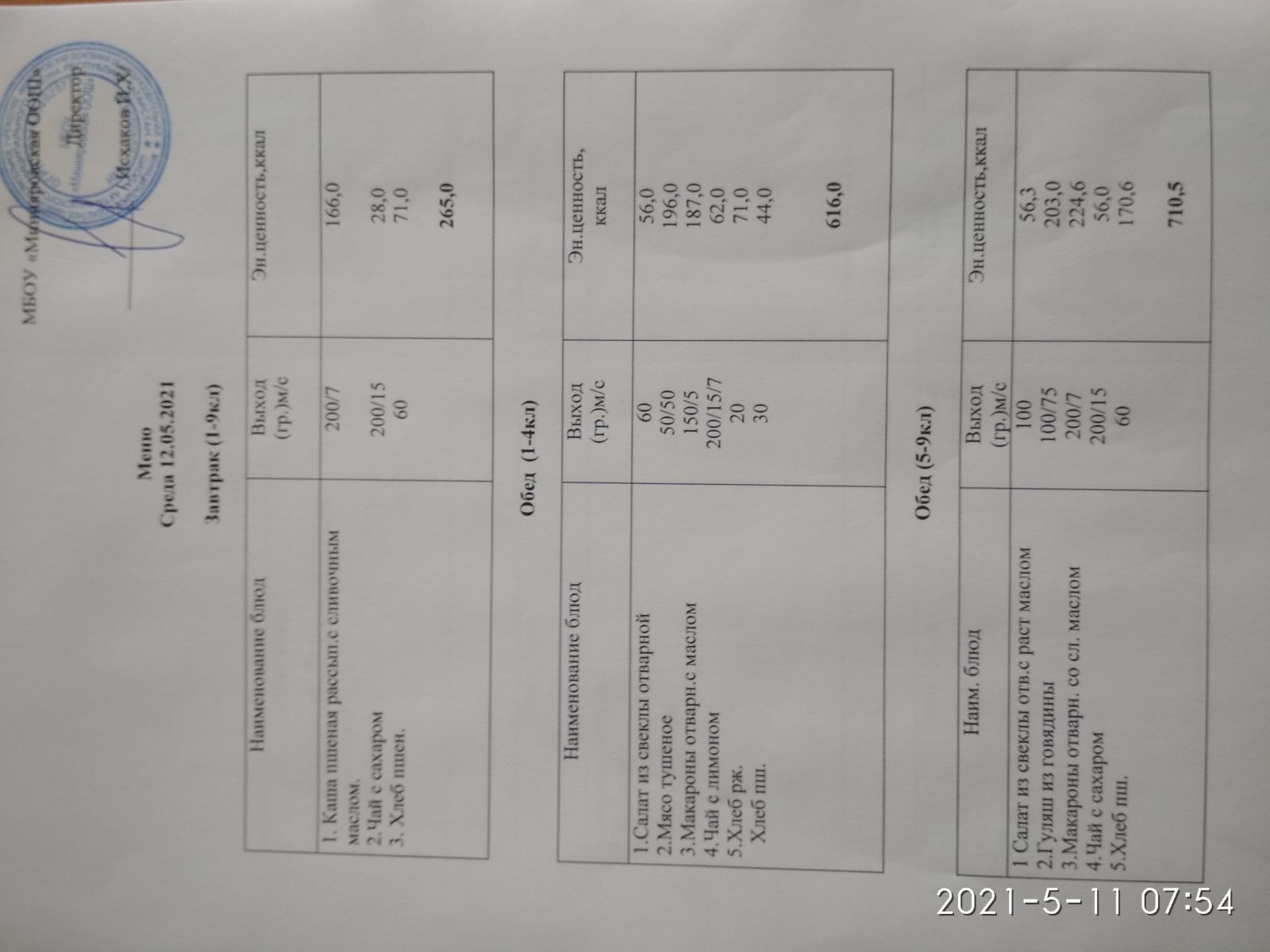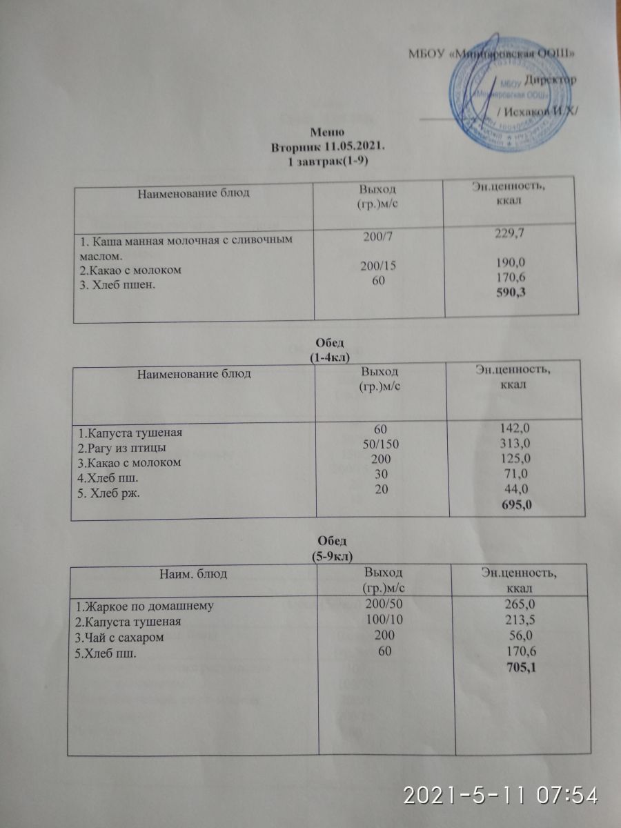 Меню МБОУ "Минняровская ООШ" на 11.05, на 12.05, на 14.05, 15.05.2021 г.