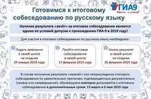 Итоговое собеседование по русскому языку для обучающихся 9-ых классов в 2018/2019 учебном году проводится 13 февраля 2019 года (во вторую среду февраля). В случае получения неудовлетворительного результата («незачет») за итоговое собеседование обучающиеся, экстерны вправе пересдать итоговое собеседование в текущем учебном году, но не более двух раз и только в дополнительные сроки, предусмотренные расписанием проведения итогового собеседования – 13 марта 2019 года (во вторую рабочую среду марта) и 6 мая 2019 года (первый рабочий понедельник мая).