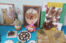 Укучылар һәм балалар бакчасында тәрбияләнүче балалар әти-әниләре белән бергәләп, көзге уңыштан, көзге яфраклардан, орлыклардан бик матур күргәзмә ясадылар.