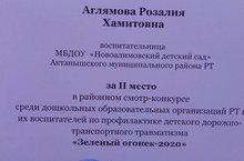 "Яшел ут - 2020" район балалар бакчалары тәрбиячеләре арасында уздырылган смотр-бәйгесендә тәрбияче Әгъләмова Р.Х. мактаулы 2 урынга лаек булды. / В районном смотре- конкурсе среди воспитателей дошкольных образовательныхучреждений "Зеленый огонек - 2020" наша воспитательница Аглямова Р.Х. заняла почетное 2 место.