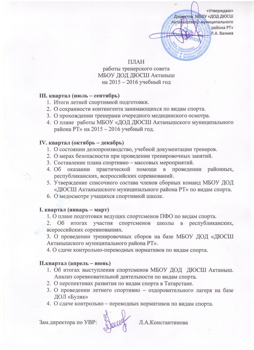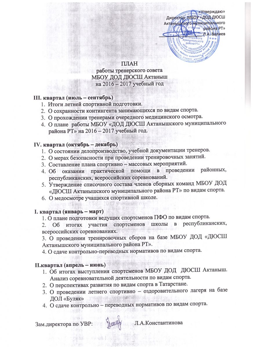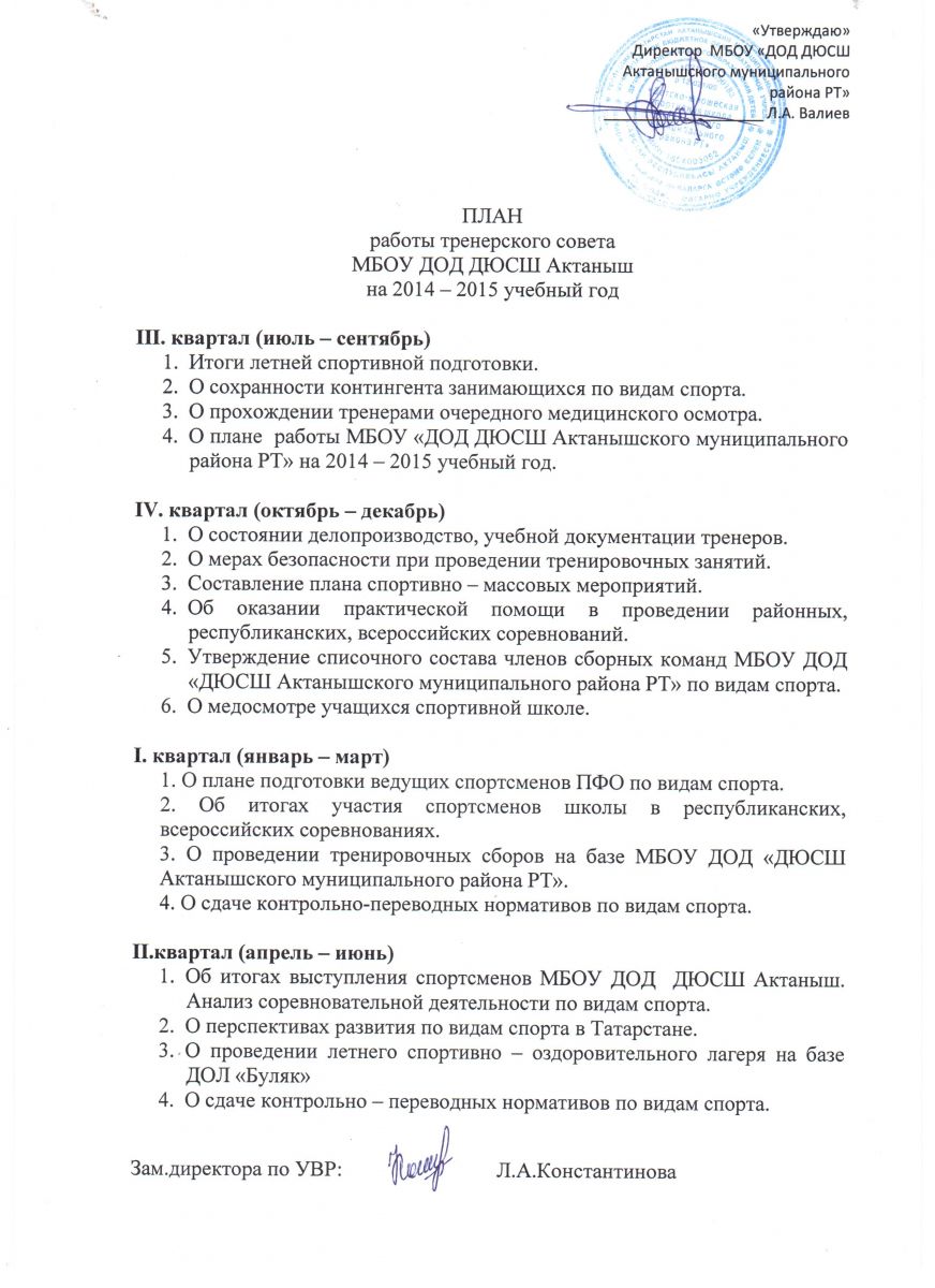 План работы тренерского совета МБОУ ДОД ДЮСШ Актаныш на 2014-2015 учебный год
