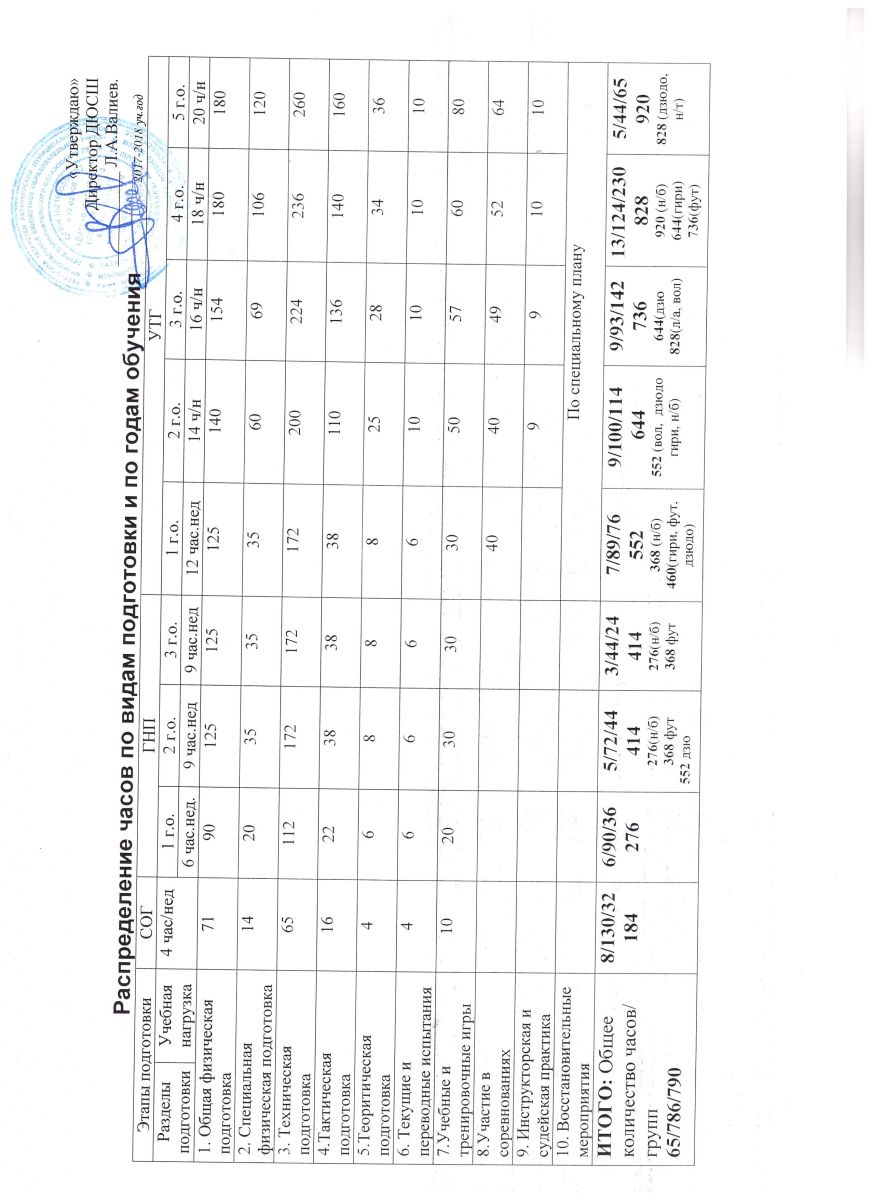Распределение часов по видам подготовки и по годам обучения 2017-2018 уч год