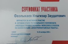 Студент 4 курса Фазлыкаев Ильгизар принял активное участие в сетевом этапе регионального чемпионата "Молодые профессоналы" WorldSkills Russia по компетенции "Электромонтажные работы" и вышел на республиканский этап. Преподаватель Даутов Айнур стал экспертом в сетевом этапе регионального чемпионата "Молодые профессоналы" WorldSkills Russia по компетенции "Электромонтажные работы"