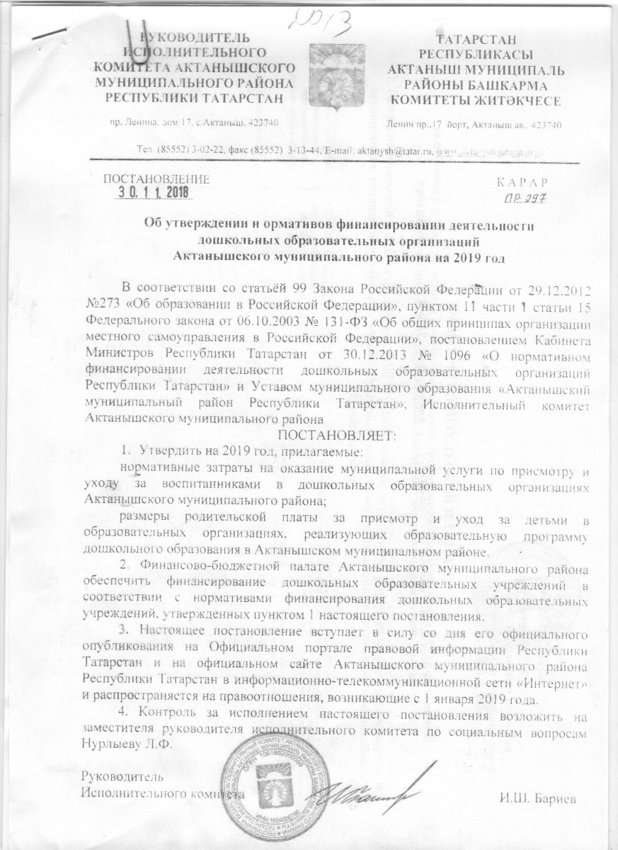 Постановление "Об утверждении нормативов финансировании деятельности образовательных организаций, реализующих программы дошкольного образования муниципального образования "Актанышский муниципальный район" на 2021 год