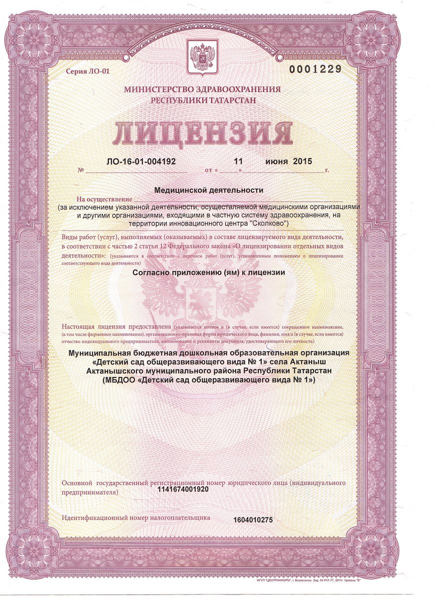 Муниципальная бюджетная дошкольная образовательная организация «Детский сад общеразвивающего вида №1» села Актаныш Актанышского муниципального района РТ