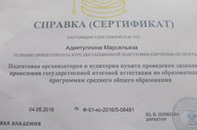Настоящим удостоверяется, что Адиятуллина М.Я. успешно прошла курс дистанционной подготовки (обучения) по программе: Подготовка организаторов в аудитории ППЭ для проведения ГИА по образовательным программам среднего общего образования.