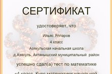 Удостоверяет, что Яппаров Ильяс ученик 4 класса успешно сдал тест по математике