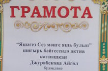 "Яшәгез Сез мәңге яшьбулып" шигырь бәйгесендә актив катнашкан Джурабекова Айгөл бүләкләнә. Җитәкчесе: Әхмәтҗанова Н.М.
