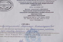 Дана Адиятуллиной М.Я. в том, что она действительно выступала по теме "Проектна работа "Хуш киләсең, Сөмбелә- Көз кызы" в рамках программы повышения квалификации по проблеме:"Основы религиозных культур и светской этики" с 20 по 29 августа 20014г. в ПМЦ ПК И ПП РО ФГАОУ ВПО КФУ.