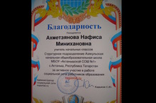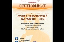 участника открытого Всероссийского конкурса "Лучшая методическая разработка-2014" Ахметзянова Н.М. учитель начальных классов Азякульской НОШ.