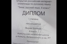 I степени награждается Эндже Хазиева ученица 4 класса Азякульской НОШ. Преподаватель: Адиятуллина М.Я. Открытая российская интернет- олимпиада по русскому языку "Зима"