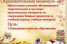 В целях достижения необходимого уровня освоения всеми обучающимися образовательного минимума, обеспечения высокого уровня обученности учащихся по основным предметам и подготовки 12-16 марта в школе пройдет сдача образовательного минимума за 3 четверть 2018-2019 учебного года.Образовательный минимум - это минимальная часть предметных знаний, которую обучающийся должен усвоить на определенном этапе учебного процесса. -