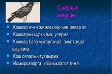 "Кошлар-безнең якын дусларыбыз" темасы буенча әңгәмә уздырдык. Анда без күчмә кошлар турында сөйләштек.Укучылар өйләрендә әти-әниләре белән кошларга оялар ясап куйдылар.
