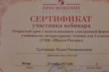 Укытучы Солтанова Л.Р. 23 ноябрь көнне электрон дәреслекләр кулланып уздырылган ачык дәрес вебинарында катнашып сертификат алды.