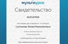 Учитель начальных классов Чуганаковской НОШ Султанова Л.Р. опубликовала "Урок изобразительного искусства в 1 классе" и награждена свидетельством "Мультиурока".