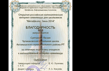 18 нче декабрь көнне 3 нче сыйныф укучылары Арсланова Лиана һәм Тазетдинова Айсылулар математикадан Бөтенрәсәй "Зима - 2013" интернет-олимпиадасында катнаштылар һәм икесе дә II дәрәҗә дипломга ия булдылар.