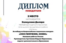 Оригами түгәрәгендә шөгыльләнүче укучыбыз - Халиуллина Диләрә "Моё увлечение, хобби" Россиякүләм иҗади конкурста катнашып 2 нче урын алды. Диләрәне һәм җитәкчесе Фирүзә Марсель кызын котлыйбыз, яңа уңышлар телибез!