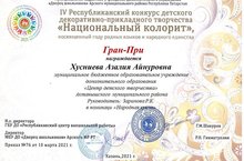 IV Республика"Милли колорит" декоратив гамәли балар иҗаты бәйгесенең "Милли курчак" номинациясендә "Модница" түгәрәгендә шөгыльләнүче Хусниева Азалия Гран-при иясе булды. Остазы - өстәмә белем бирү педагогы Зарипова Разида Кашбелгыйлем кызы.