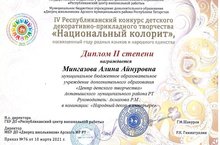 IV Республика"Милли колорит" декоратив гамәли балар иҗаты бәйгесенең "Интерьерда халык бизәлеше" номинациясендә "Бисер" түгәрәгендә шөгыльләнүче Мингазова Алинә икенче урынга лаек булды һәм Диплом белән бүләкләнде . Остазы - өстәмә белем бирү педагогы Акмалова Разифа Мирсәгыйть кызы.