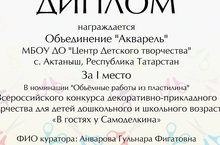 Работа "Символ года" (объединение «Акварель») в номинации «Объемные работы из пластилина» Всероссийского конкурса декоративно-прикладного творчества для детей дошкольного и школьного возраста заняла 1 место.