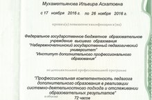 Педагог ДО Мухаметьянова Ильвира Асхатовна с 17 по 26 ноября 2016 г. была на курсах повышения квалификации в ФГБОУ ВПО «НГПУ» г.Н.Челны по теме «Профессиональная компетентность педагога дополнительного образования в реализации системно-деятельностного подхода и отслеживании образовательных результатов».