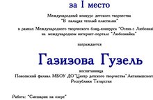 Воспитанница ЦДТ Газизова Гузель заняла 1 место в Международном конкурсе детского творчества "В пальцах теплый пластилин", с работой "Смешарик на озере"