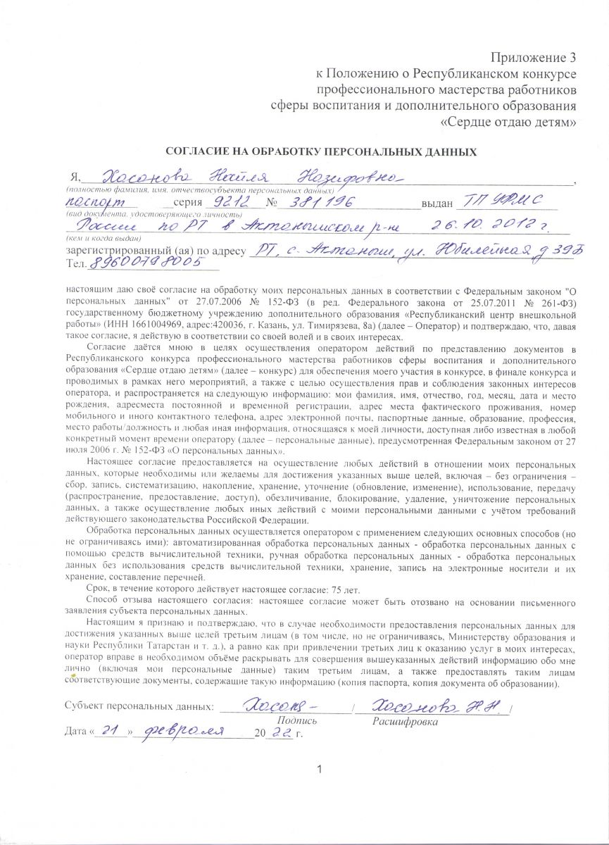 Согласие на обработку персональных данных педагога ДО Хасановой Н.Н.