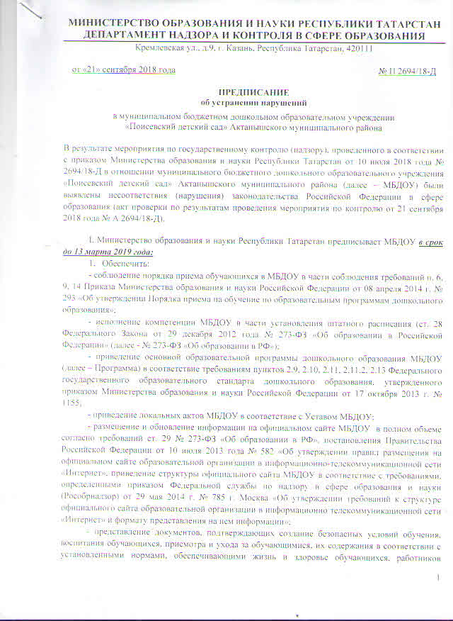 Предписание № П 2694/18-Д об устранении нарушений-лист 1