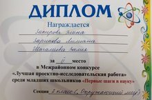 Поздравляем! Второе место в Межрайонном конкурсе "Лучшая проектно-исследовательская работа" среди младших классов "Первые шаги в науку" 2 -го класса, руководитель: Айзира Хабиповна Акмалова. Молодцы! Так держать!