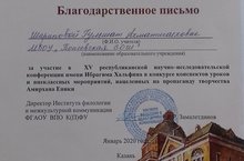 Поздравляем! Гульшат Ахматшаеховна Шарипова (учитель истории и обществознания) награждается Благодарственным письмом и сертификатом за участие в 15 -ой республиканской научно-исследовательской конференции имени Ибрагима Хальфина в конкурсе конспектов уроков и внеклассных мероприятий, нацеленных на пропаганду творчества Амирхана Еники