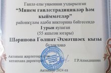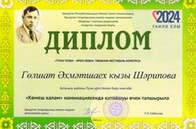 Мәктәпнең тарих һәм җәмгыять белеме укытучысы Гөлшат Әхмәтшәех кызы Шәрипова "Туган телем-иркә гөлем" төбәкара фестиваль - конкурсында катнашып дипломга ия булды. Котлыйбыз!