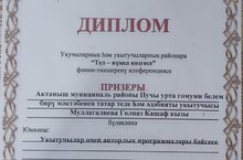 Мәктәбебезнең татар теле һәм әдәбияты укытучысы Гөлназ Кашаф кызы Муллагалиева Сарман муниципаль районы “Сарман гимназиясе” тарафыннан оештырылган “Тел – күңел көзгесе” районара фәнни-гамәли конференциясенең “Укытучылар өчен авторлык программалары” юнәлеше буенча призер дипломына ия булды. Котлыйбыз!