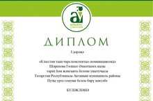 II Республикакүләм методик эшкәртмәләр конкурсының "Класстан тыш чара конспекты" номинациясендә катнашып мәктәбебезнең тарих һәм җәмгыять белеме укутычысы Шәрипова Гөлшат Әхмәтшәех кызы I дәрәҗә җиңүче дипломы белән бүләкләнде. Гөлшат Әхмәтшәех кызын җиңүе белән котлыйбый, алда да уңышлар теләп калабыз!