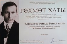 6 класс укучысы Ханнанова Рәмилә "Ядкярләрдә - Тукай рухы" бәйгесендә катнашып Рәхмәт хаты белән бүләкләнә. Җитәкче: Гөлназ Кашаф кызы Муллагалиева.