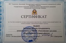 Ученик 9 класса Вагизов Айнур награждается сертификатом участника в конкурсе профессионального мастерства "Профессиональный дебют" по компетенция "электромонтажные работы". Молодец, Айнур! Так держать!
