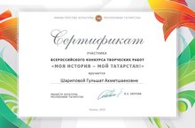 Гульшат Ахматшаеховна Шарипова учитель истории награждается сертификатом участника Всероссийского конкурса творческих работ "Моя история - Мой Татарстан"