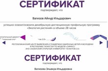 8 класс укучысы Айнур Вагизов һәм 5 класс укучысы Эльвира Вагизова "Үсемлекләр экологиясе" дистанцион профиль программасын яхшы үзләштерү нәтиҗәсендә сертификат алдылар. Җитәкче: Алсу Мирзаян кызы Вагизова.