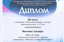 Ученица 5 класса Эльвира Вагизова на открытом республиканском конкурсе-выставок декоративно-прикладного творчества "Поздравление Деду Морозу" в номинации: "Новогодний подарок, сувенир" возрастная группа 11-12 лет заняла 3 место и награждается дипломом. Молодец, Эльвира!