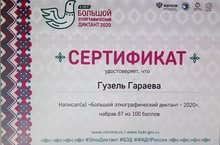 Поздравляем! Ученица девятого класса Гузель Гараева участвовала в большом этнографическом диктанте и набрав 87 баллов из 100, награждается сертификатом.