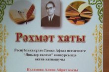 Республикакүләм Гамил Афзал исемендәге "Яшьләр каләме " конкурсында актив катнашучы Исламова Алинә Айрат кызы Рәхмәт хаты белән бүләкләнә. Афәрин, Алинә!