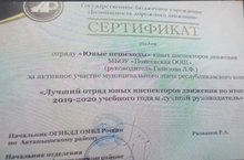 Сертификатом награждается отряд "Юные пешеходы" юных инспекторов движения МБОУ "Поисевская СОШ" за активное участие муниципального этапа республиканского конкурса "Лучший отряд юных инспекторов движения по итогам 2019-2020 учебного года и лучший руководитель". Руководитель: Лейсан Фидарисовна Газизова.