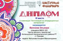 Ученица четвертого класса Эльвира Вагизова заняла третье место в конкурсе декоративно-прикладного творчества "Цветочный фейерверк". Молодец! Желаем дальнейших побед!