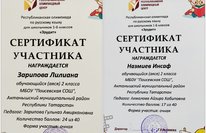 По итогам республиканской олимпиады по русскому языку для школьников 1-6 классов "Эрудит" сертификатом участника награждаются учащиеся второго класса Зарипова Лилиана, педагог: Гульназ Амирхановна Зарипова и Назмиев Инсаф, педагог: Айзира Хабиповна Акмалова. Молодцы! Так держать!