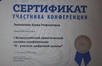 Зухра Рифкатовна Зиннатова учитель математики получила сертификат участника Всероссийской практической онлайн-конференции "Я - учитель цифровой школы". Желаем дальнейших успехов в работе!